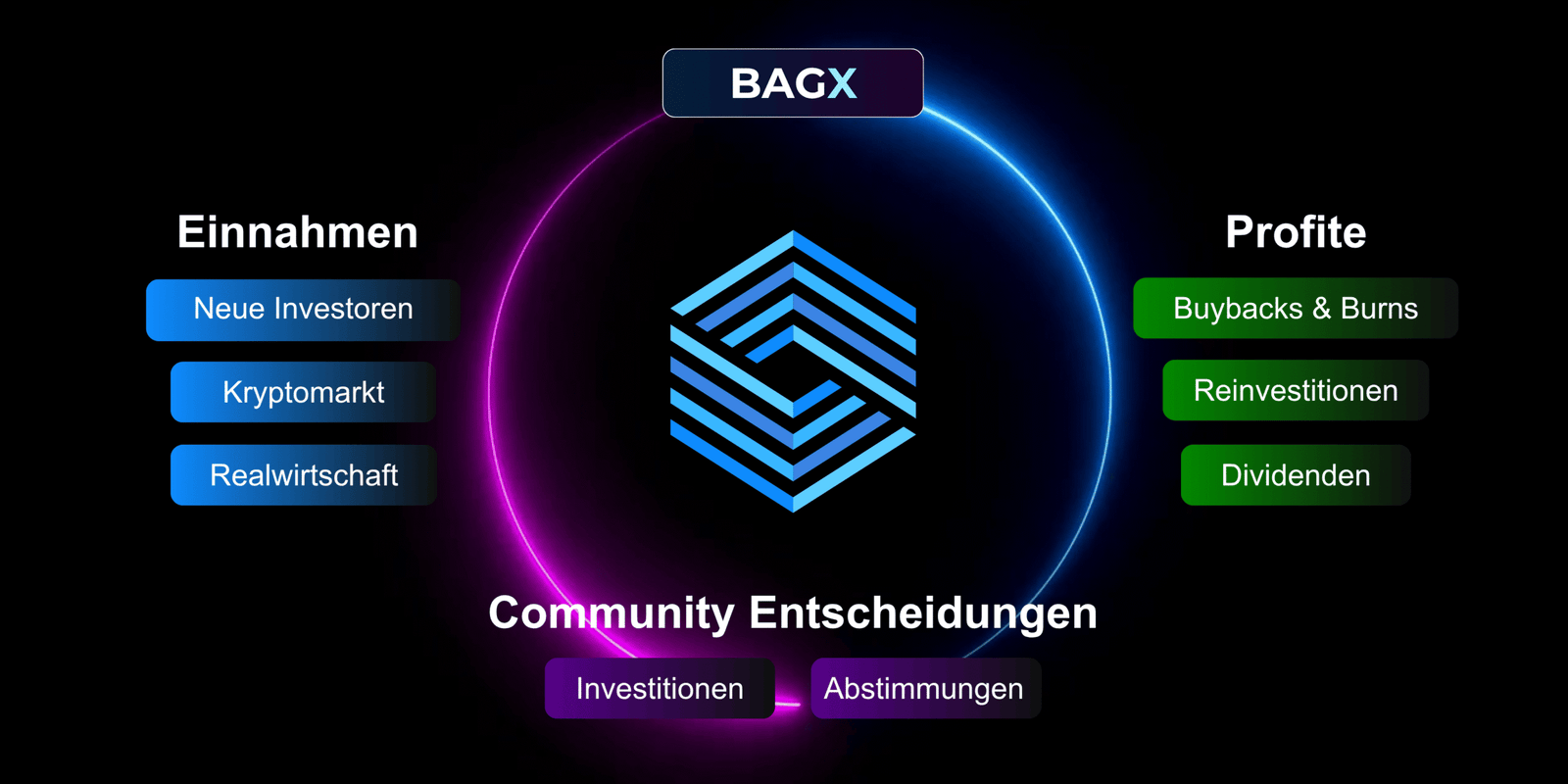 Die erzielten Einnahmen werden systematisch und kontrolliert auf drei zentrale Bereiche verteilt: Buybacks und Burns, Dividendenausschüttungen sowie Reinvestitionen in das weitere Wachstum des Ökosystems. Diese strukturierte Allokationsstrategie verfolgt das Ziel, den Wert der BAGX-Anteile langfristig zu steigern, attraktive Ausschüttungen für die Mitglieder zu ermöglichen und gleichzeitig die kontinuierliche Weiterentwicklung des Projekts sicherzustellen.