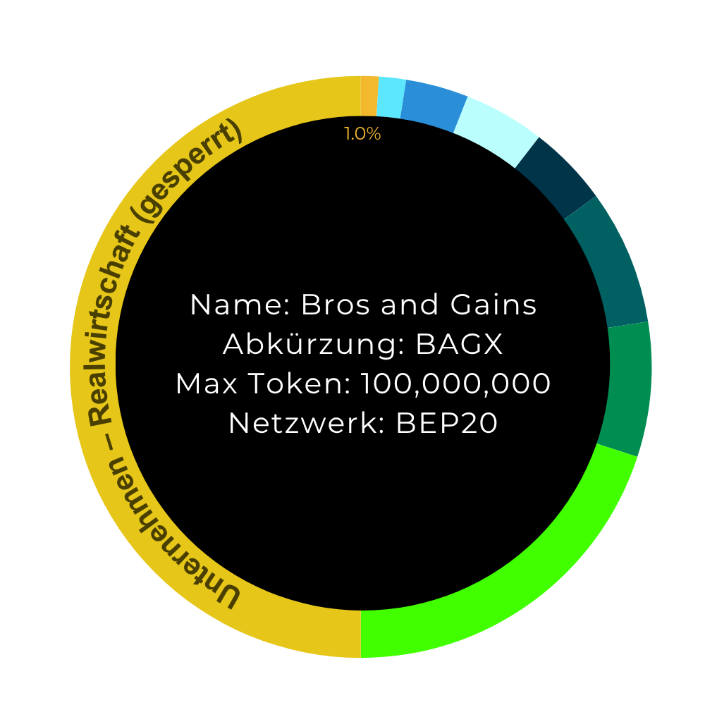50.0% Realwirtschaft/ Unternehmensstruktur: 50 % aller BAGX-Token sind vom Handel ausgeschlossen und werden von unseren Investmentgesellschaften gehalten. Sie dienen als Sicherheit für unsere Unternehmensstrukturen sowie für Investoren, die außerhalb des Kryptosektors in Bros & Gains investieren. Dieses Vorgehen ermöglicht es der Community, beide Geschäftsbereiche künftig unabhängig voneinander zu entwickeln und das Projekt als Ganzes nachhaltig zu skalieren.