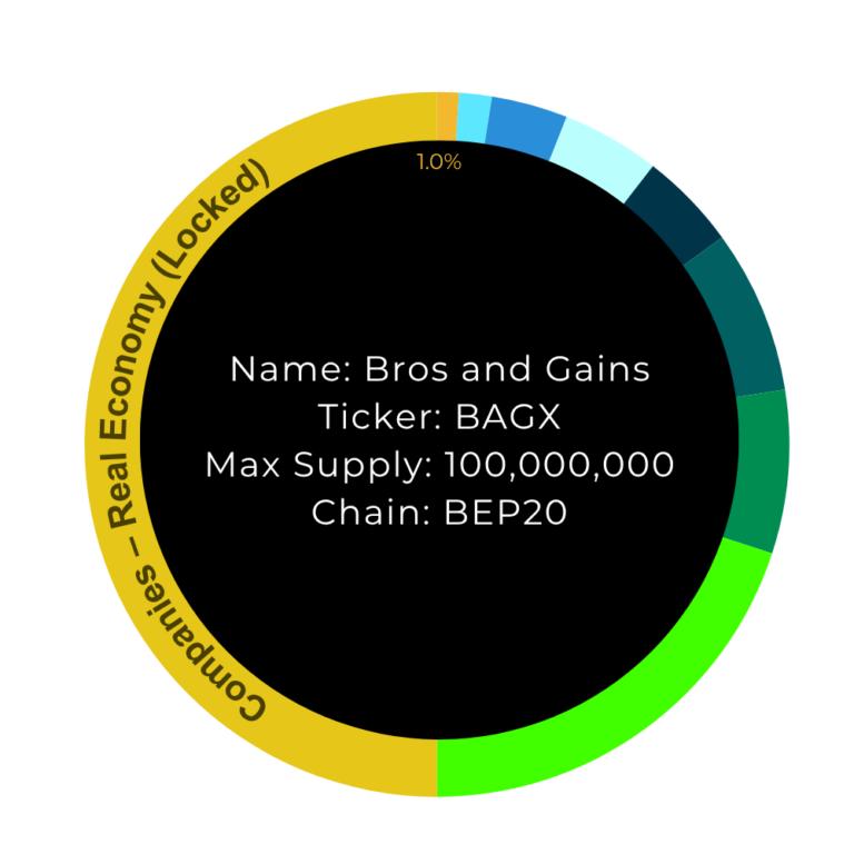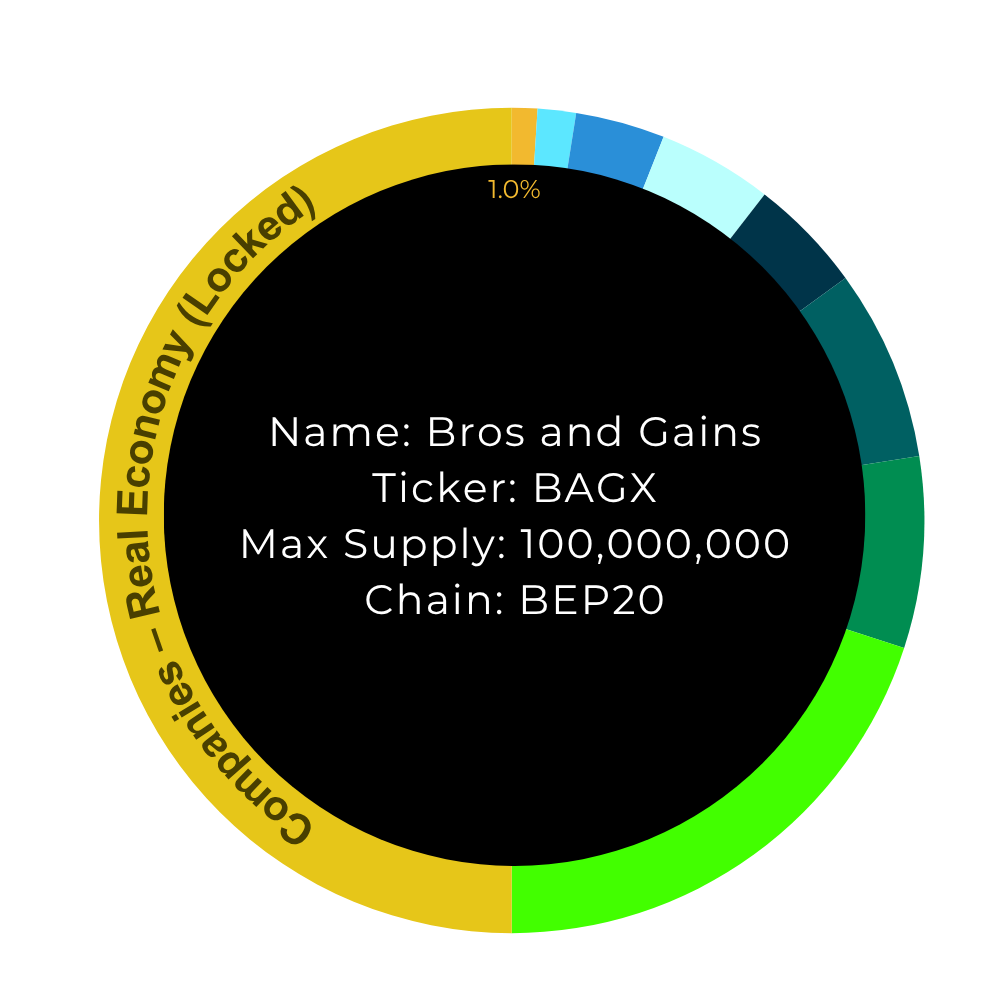 50.0% BAGX Companies: 50% of all BAGX tokens are locked from trading and held by our investment entities. They serve as collateral for our corporate structures as well as for investors who participate in Bros & Gains outside the crypto sector. This approach enables the community to manage and develop both areas independently in the future while allowing the overall project to scale sustainably.